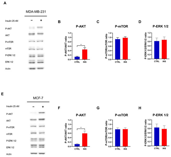 Given the absence of proliferation induction triggered by high-glucose containing medium, it was decided not to further investigate this condition and instead focus on high insulin level. Accordingly, to determine whether the effects of insulin are mediated by alterations in insulin signalling, the phosphorylation of proteins downstream of the insulin receptor was examined following 48 h of exposure to this anabolic hormone. Insulin induced AKT phosphorylation in both MDA-MB-231 (p = 0.017) (Figure 3A,B) and MCF-7 (p = 0.010) (Figure 3E,F) cells but failed to induce the phosphorylation of mTOR (p = 0.514 and p = 0.945 for MDA-MB-231 and MCF-7, respectively) and ERK 1/2 proteins (p = 0.781 and p = 0.785 for MDA-MB-231 and MCF-7, respectively) (Figure 3C,D,G,H).