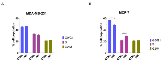 Considering the ability of inulin to induce the proliferation of MCF-7 but not MDA-MB-231 cell line, it was next evaluated whether insulin could affect the cell cycle in these cells. A 48 h treatment with 25 nM insulin did not influence the cell cycle of MDA-MB-231 cells (p = 0.541, p = 0.142 and p = 0.699 for G0/G1, S, and G2/M phases, respectively) (Figure 4A). On the contrary, high insulin level increased the percentage of MCF-7 cells in the S phase (p < 0.001) while decreasing the number of cells in the G0/G1 phases (p < 0.001) of the cell cycle (Figure 4B). However, these effects occurred without changes in the percentage of cells on the G2/M phase of the cell cycle (p = 0.689) (Figure 4B).