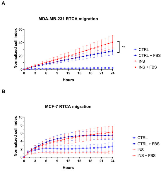 In light of the previously reported ability of insulin to promote primary tumour growth and metastasis [28] and the higher breast cancer mortality in subjects with high insulin level [7], we evaluated if this condition could enhance the migration of the studied BC cell lines. For this purpose, the RTCA-based migration assay was performed. In the presence of the chemoattractant, 48 h insulin treatment induced a higher migration rate when compared with control MDA-MB-231 cells (p = 0.001) (Figure 6A). In contrast to MDA-MB-231, MCF-7 cells did not show a similar migration ability since the addition of insulin did not increase the migration rate of chemoattracted cells (p = 0.299) (Figure 6B).