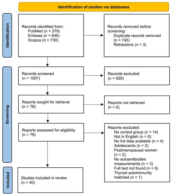 The initial literature search yielded 1755 results. After the removal of 745 duplicates and 3 retracted articles, 1007 records remained. Of these, 929 were excluded based on article type as well as title and abstract screening. As a result, 78 studies were selected for full-text review. Of these, 38 were excluded due to the following reasons: 14 due to the absence of a control group; 6 due to the lack of an English-language version; 4 due to incomplete data; 2 due to the inclusion of adolescents in the study population; 2 due to the inclusion of postmenopausal women in the study group; 3 due to the absence of autoantibody measurements; 6 due to the unavailability of the full text; and 1 due to the case and control groups having been pre-matched for thyroid autoimmunity at the study design stage. Ultimately, 40 studies were included in the systematic review and meta-analysis (Figure 1).