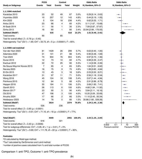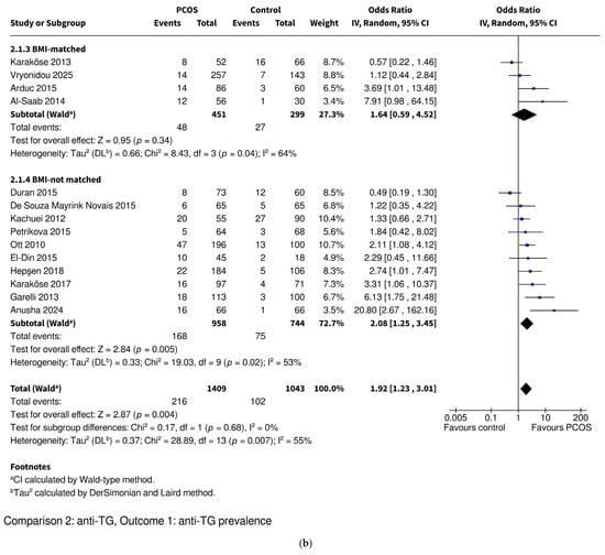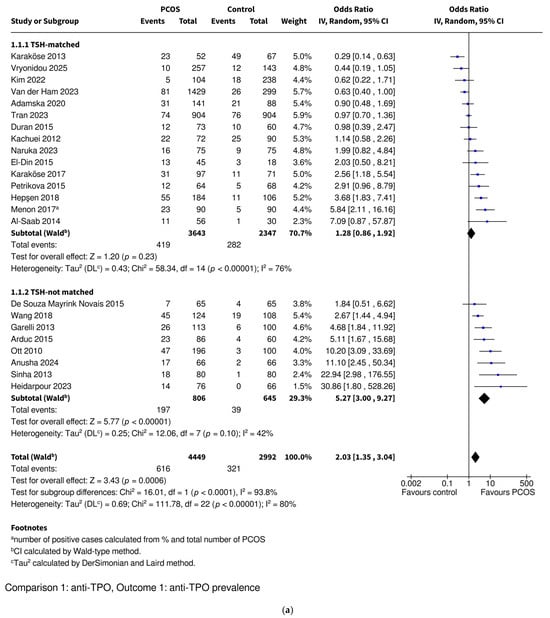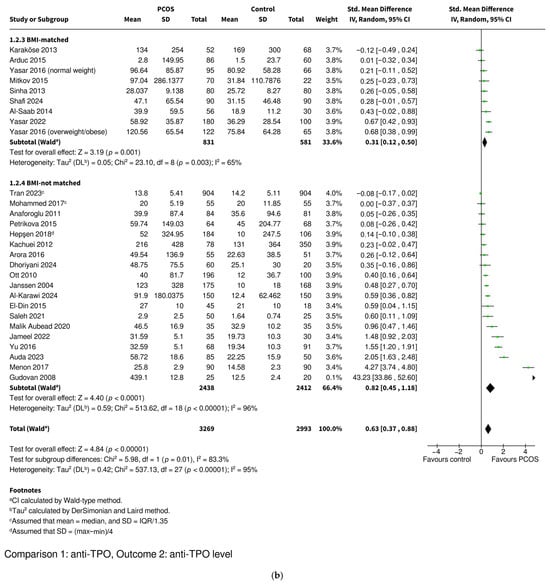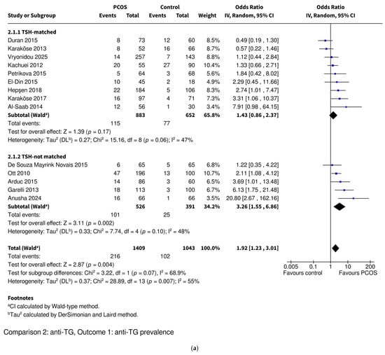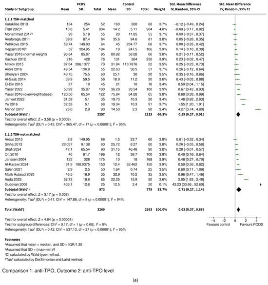 Meta-analyses were conducted using Review Manager (RevMan), version 5.4.1, The Cochrane Collaboration, London, UK. Forest plots were used to present individual study data and pooled effect estimates. Studies were ordered within the plots according to the effect size. For dichotomous outcomes (prevalence of antibody positivity), odds ratios (ORs) with 95% confidence intervals (CIs) were calculated. For continuous outcomes (serum antibody levels), standardized mean differences (SMDs) with 95% CIs were used. Although all studies reported results in the same unit (IU/mL), different measurement methods were used across the studies; therefore, SMD was chosen to account for potential variability in the measurement scales. The inverse variance method was applied under a random effects model. Between-study heterogeneity was assessed using the I2 statistic, with between-study variance (τ2) estimated using the DerSimonian and Laird method. A subgroup analysis was performed to assess the potential impact of matching for BMI and TSH level between the PCOS and control groups. All statistical tests were two-sided, with p-values < 0.05 considered statistically significant.