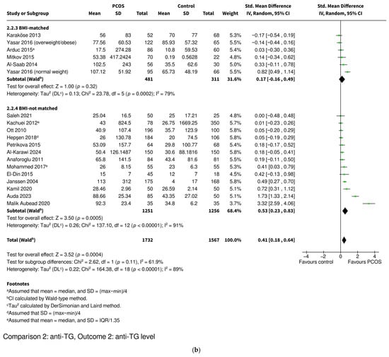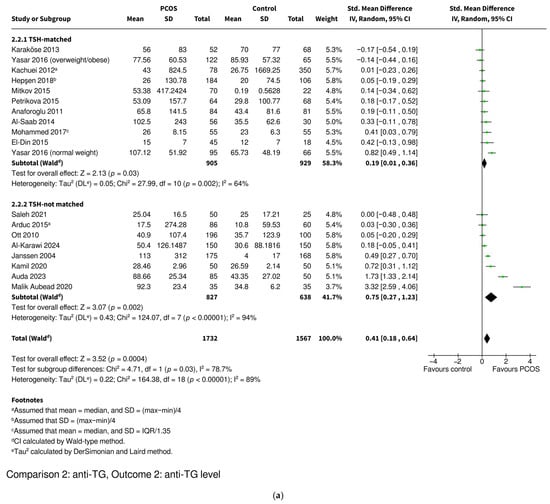 - Anti-TG levels were significantly increased in 10 studies, while 9 reported comparable levels between the PCOS and control groups.