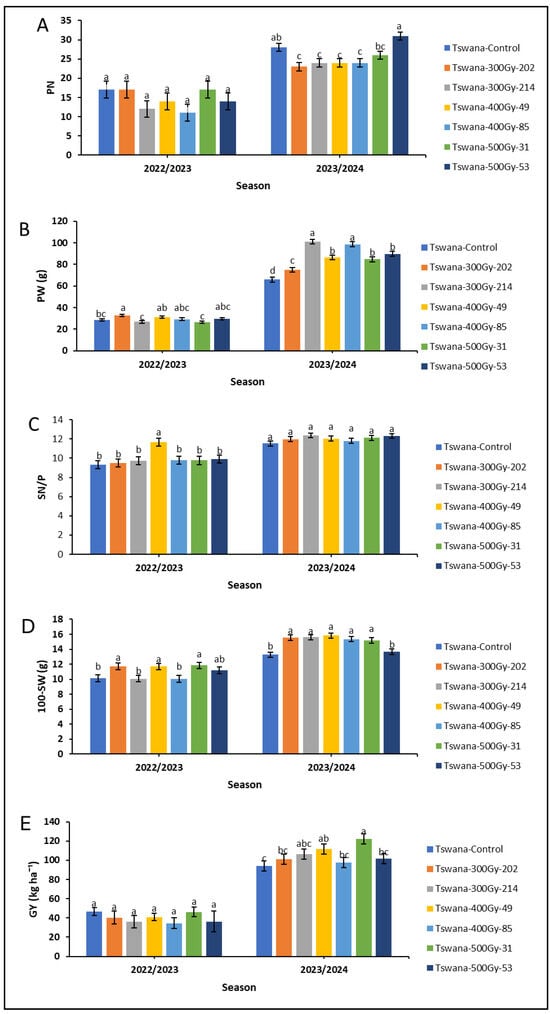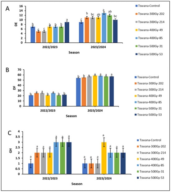 2.2. Performance of M5 Cowpea Mutants in Agronomic Traits Across the Two Seasons