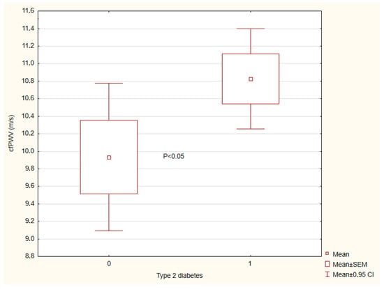 Carotid–femoral pulse wave velocity (cfPWV) depending on presence (1)/absence (0) of type 2 diabetes. There are 42 and 52 in groups (0) and (1), respectively.