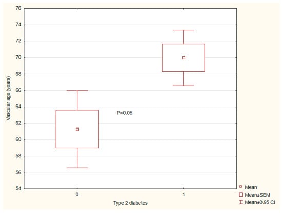 Vascular age depending on presence (1)/absence (0) of type 2 diabetes. There are 42 and 52 patients in groups (0) and (1), respectively.