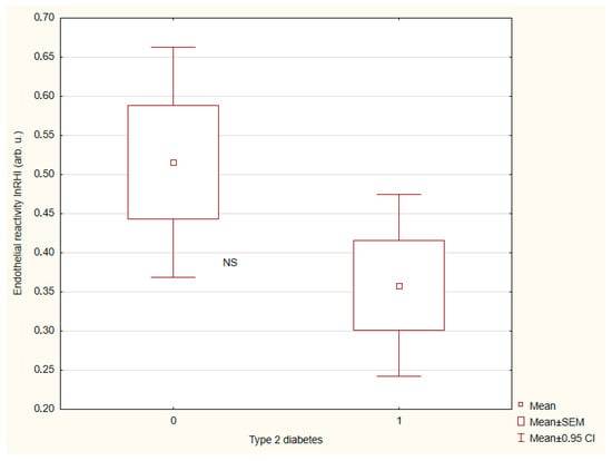 Endothelial reactivity depending on presence (1)/absence (0) of type 2 diabetes. There are 40 and 48 patients in groups (0) and (1), respectively.