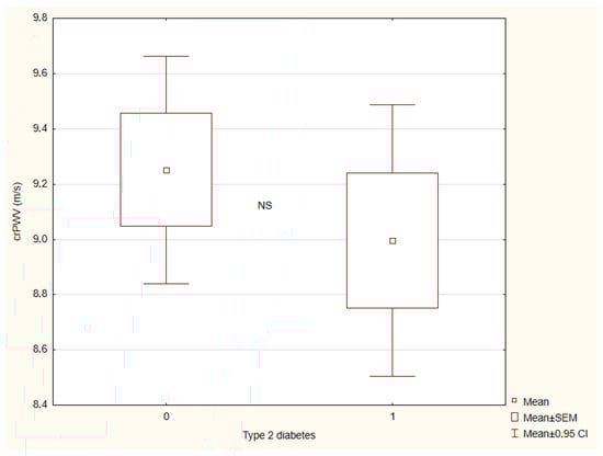 Carotid–radial pulse wave velocity (crPWV) depending on presence (1)/absence (0) of type 2 diabetes. There are 42 and 52 patients in groups (0) and (1), respectively.