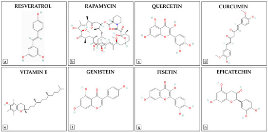 Chemical structure of the main natural compounds with senotherapeutic properties. (a) Resveratrol: polyphenolic phytoalexin. (b) Rapamycin: macrocyclic lactone. (c) Quercetin: flavonoid. (d) Curcumin: polyphenol. (e) Vitamin E: fat-soluble micronutrient composed of tocopherols and tocotrienols. (f) Genistein: isoflavone. (g) Fisetin: flavonol. (h) Epicatechin: flavonol. Images acquisition from PubChem.