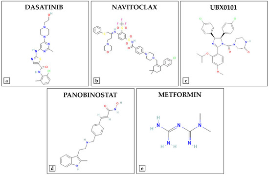 Chemical structure of the main synthetic compounds with senotherapeutic properties. (a) Dasatinib. (b) Navitoclax. (c) UBX0101. (d) Panobinostat. (e) Metformin. Images acquisition from PubChem.