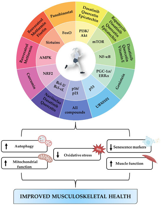 Overall, considering the growing impact of age-related musculoskeletal disorders and the key role of cellular senescence in their progression, it is necessary to identify targeted therapeutic approaches capable of counteracting the accumulation of senescent cells and their deleterious effects. Importantly, the complexity and multitude of molecular pathways involved in musculoskeletal aging requires the development of therapies tailored to the needs of individual patients, highlighting the need to deepen our knowledge of the effects and targets of senotherapeutics and physical exercise. Therefore, the aim of our review was to (i) provide a comprehensive overview of the effects of natural and synthetic anti-senescence compounds used in the treatment of age-related musculoskeletal diseases; (ii) analyze the role of physical exercise in modulating cellular senescence, evaluating its potential as a complementary strategy to drug therapy to enhance its therapeutic effects; (iii) summarize the main clinical evidence about the efficacy and the safety of senotherapeutics in the context of age-related musculoskeletal disorders.