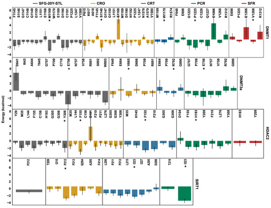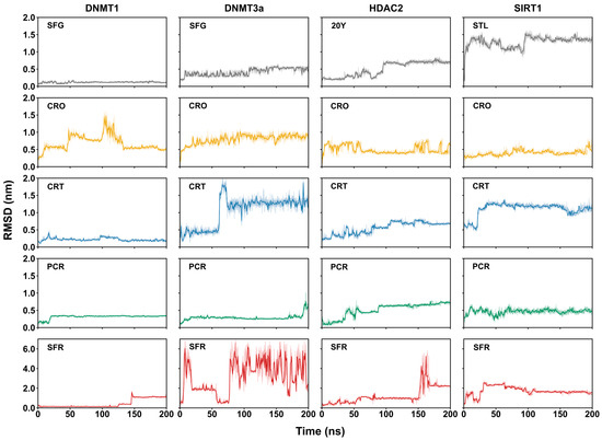 The control complexes DNMT1:SFG and DNMT3a:SFG display stable RMSD profiles (Figure 1) and a high number of close contacts (463.60 ± 25.82 and 367.27 ± 31.44, respectively), with consistent minimum distances (~0.16 nm) (Figure S4), indicating that, as expected, the SFG ligand maintains a consistent binding pose throughout the simulation. HDAC2:20Y shows pose stabilization after ~100 ns, reaching 149.04 ± 20.29 contacts and a ~0.25 nm average distance (Figure S4). In contrast, the SIRT1:STL complex undergoes significant conformational rearrangement (ligand RMSD >1.5 nm) and forms few stable contacts (74.56 ± 22.52). This finding is consistent with the known requirement of two resveratrol molecules for proper stabilization, which interact with multiple sites in NTD of SIRT1 [49,50]. Still, the single resveratrol molecule remains relatively close to the binding pocket (~0.25 nm).