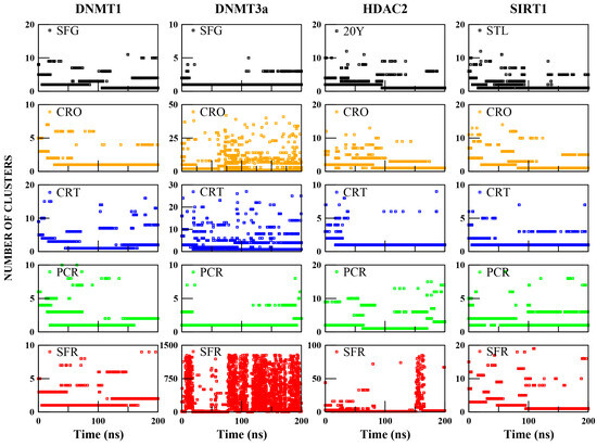 As shown in Figure 2, the control complexes (DNMT1:SFG, DNMT3a:SFG, HDAC2:20Y, SIRT1:STL) show low cluster variability over time. DNMT3a:SFG mainly adopts one cluster (97% of the simulation), while the others adopt two dominant clusters covering 71% (DNMT1:SFG), 87% (HDAC2:20Y), and 85% (SIRT1:STL) of the trajectories (Table S1). Representative structures are shown in Figure S6, confirming that all control ligands maintain stable binding poses, with only minor orientation changes within the pocket.