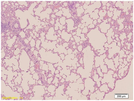 Histological section of lung tissue from Group A showing intraalveolar hemorrhage and emphysema. Alveolar spaces are filled with erythrocytes, indicative of hemorrhage, and exhibit dilation consistent with emphysematous changes (HE, ×10).