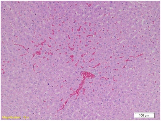 Histological analysis was performed using a light microscope (BX40, Microscope Central, Olympus, Tokyo, Japan) by two independent pathologists (N.Č., E.L.), blinded to group assignments. Morphological changes were documented and photographed. Discrepancies in interpretation were resolved by consensus. The evaluation focused on identifying features such as degeneration, necrosis, congestion, hemorrhage, and inflammatory infiltrates across the different experimental groups.