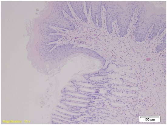 In the gastroesophageal junction, muscle hypertrophy, congestion, and subepithelial eosinophilia were noted across all groups. Figure 7 depicts subepithelial eosinophilia (HE, ×200).