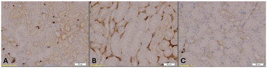 Immunohistochemical staining of kidney tissue showing E-cadherin expression in Group A (A), Group B (B), and Group K (C). Distal renal tubules exhibit positive membranous staining, while proximal tubules show reduced or absent expression. Magnification: ×20; scale bar: 50 µm.