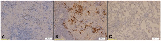 Hypothermia modulates the host immune response, particularly affecting the number and activity of neutrophils, leading to their downregulation [47]. Myeloperoxidase (MPO) is a myeloid marker that strongly stains neutrophils and variably stains other granulocytes. It is a non-specific marker of neutrophil activity and inflammation [48]. Based on this, a decreased number of MPO-positive granulocytes is expected in the lungs of rats that died from hypothermia. In our study, we observed a reduced number of MPO-positive granulocytes in lung specimens from the control (K) group and the experimental groups (A and B).