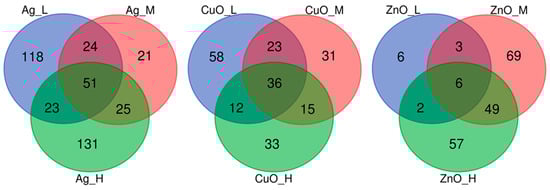 The distribution of common and unique DEmiRNAs after exposure of MSCs to three different doses (L—low; M—medium; H—high) of nanomaterials (Ag, CuO, and ZnO NPs).