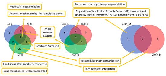 A list of the three most significantly affected pathways for each exposure condition is presented in Table 3. Due to more mRNAs being upregulated after the exposure to Ag NPs, we can assume that most of the affected pathways were induced. A close functional connection of two significant pathways (Post-translational protein phosphorylation and Regulation of Insulin-like Growth Factor (IGF) transport and uptake by Insulin-like Growth Factor Binding Proteins (IGFBPs)) is suggested because the same DEGs are involved in both of them after three different exposures (low and medium dose of CuO and medium dose of ZnO NPs).