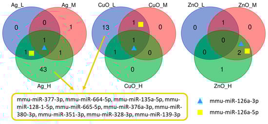 Although a low number of DEmiRNAs were detected, unlike the mRNA, their expression changes were shared among more conditions. For example, two DEmiRNAs from the mmu-miR-126 family were observed in almost all conditions. Ten common DEmiRNA were also found after exposure to a high dose of Ag and a low dose of CuO NPs (Figure 3).
