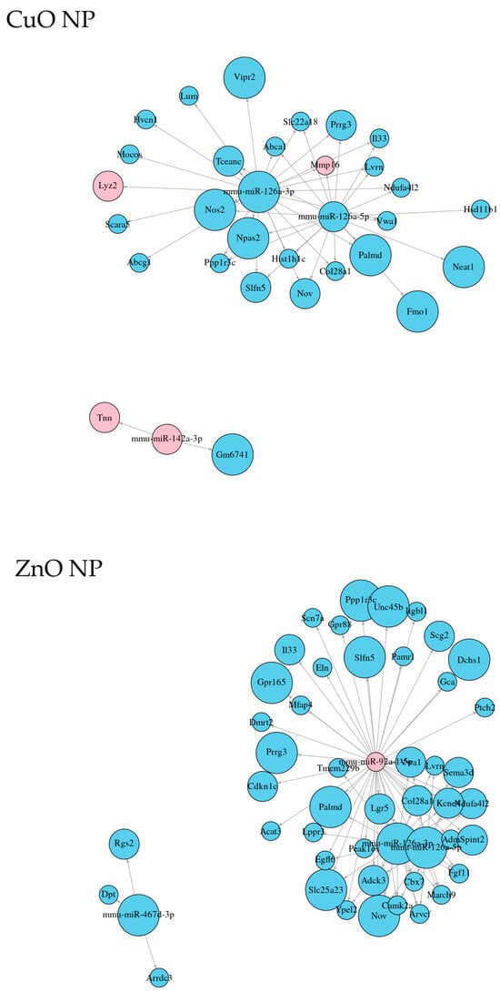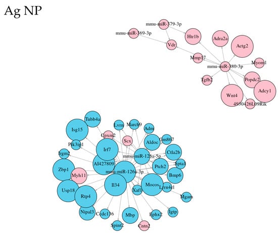 Plots showing the top 50 significant interactions of DEmiRNAs-DEGs after the exposure of MSCs to three nanomaterials (Ag, CuO, and ZnO NPs). Blue and red color of the nodes indicates RNA upregulation and downregulation, respectively. The size of the nodes represents the strength of deregulation (log2fold change).