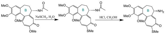 Synthesis of deacetylthiocolchicine from thiocholcine derivative (adapted from []).