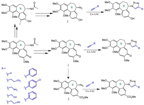 Synthesis of triazoles derived from colchicine, allocolchicine, and N-acetylcolchinol (adapted from [,]).