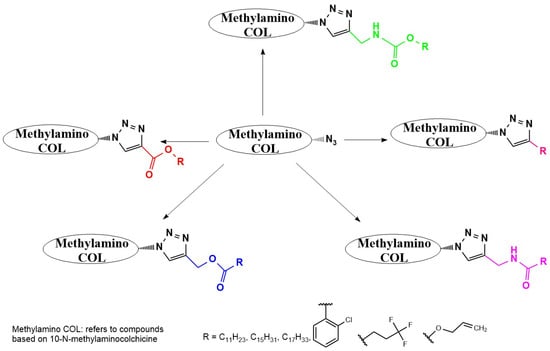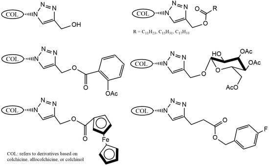 Examples of colchicinoids synthesized by “click” conjugation (adapted from [,]).