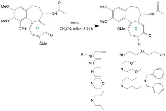 Deacetylation at the C-7 position generates N-deacetylcolchicine, typically derived from thiocolchicine precursors (Figure 7). Klejborowska et al. [,,] synthesized a series of C-7 amino-functionalized derivatives using this approach. While these compounds exhibited reduced potency against cancer cell lines compared to COL or thiocolchicine precursors, they demonstrated slightly lower cytotoxicity toward normal cells. Critically, the introduced amino group serves as a versatile handle for subsequent functionalization to enhance pharmacological performance.