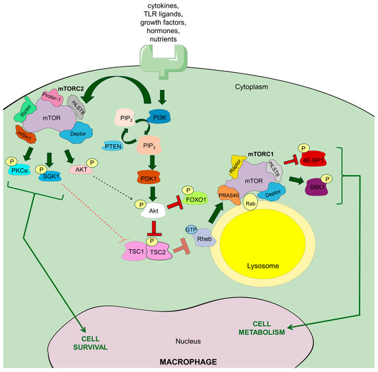 As mentioned above, mTOR kinase forms two distinct complexes, namely mTORC1 and mTORC2, by attaching specific adapter proteins that target it to the lysosomal or plasma membrane, respectively [11]. In the case of differentiated macrophages, mTORC1 signaling can be induced by both cellular/immune and metabolic factors, including growth factors, hormones, cytokines, TLR ligands, and nutrients, particularly amino acids [17,24]. It is worth noting that mTORC1 activation prompts macrophages towards enhanced glucose consumption [104]. In contrast, the signals that activate mTORC2 are less well understood. Nutrients and growth factors also affect mTORC2 activation, but the context in which they modulate mTORC2 appears to be much more complicated than for mTORC1 [105].