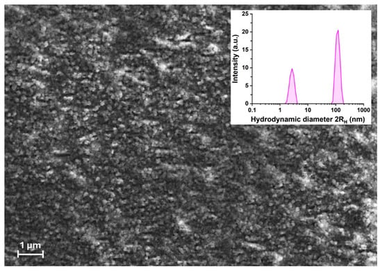 SEM image at time zero: small oligomers representing the early oligomeric state. The inset shows the hydrodynamic diameter (2RH) from DLS measurements of the insulin solution prior to incubation. Two populations (purple histograms) are observed, with 2RH values of 2.7 ± 0.5 nm and 119.0 ± 20.0 nm, each with a polydispersity index (PDI) of 0.03. Size distribution was determined by intensity-weighted analysis using the NNLS algorithm.