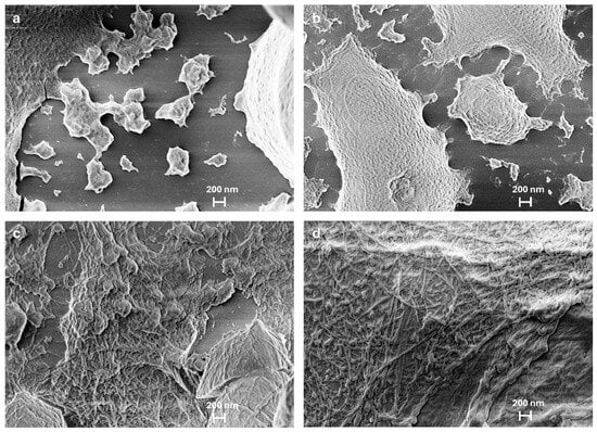 The formation of large aggregates during incubation has been previously documented in the literature []. Although their timescale and conditions differ significantly, the number and size of the larger particles continue to grow with incubation time. The SEM images depict clear progression: from initial aggregation, marked by growing protein clusters, to the development of a complex network of interwoven filaments that eventually mature into fibrils. Notably, filaments are found on pre-existing protein layers and on the surfaces of large aggregates, suggesting a surface-catalyzed fibrillation mechanism (Figure S1.2 of the Supplementary Materials). Previous research by Nayak et al. [] has demonstrated that surface roughness accelerates aggregation and fibrillation, likely by increasing the local concentration of protein molecules. Furthermore, it is known that hydrophobic interfaces play an important role in the monomers’ unfolding and subsequent aggregate formation []. Our findings support this assessment, highlighting the role of heterogeneous surfaces in fibril formation dynamics which become observable after 100 min of incubation. Importantly, the exposed β-sheet regions on the aggregate surfaces play a pivotal role in templating new proto-filaments and protofibrils, while also facilitating their intertwining [].