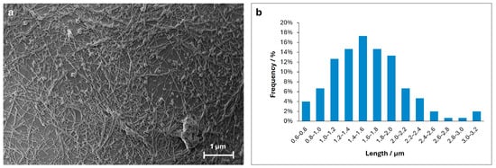 After 60 min of incubation (Figure 2b), the smallest aggregates become less prevalent, while those as large as 1 to 3 µm increase in proportion. Notably, there is significant expansion in the large protofibrillar regions, which now dominate approximately 50% of the observable surface area. Within these regions, the surface corrugations become more evident, suggesting the emergence of fibrillar structures. This stage likely represents a phase in which protofibrils evolve into more organized intermediates, exhibiting greater structural cohesion. At this stage, fibrils remain indistinct, preventing an accurate measurement of their average length and suggesting that fibrillation is still in its intermediate phase. At 100 min of incubation (Figure 2c), individual aggregates are no longer visible, now forming a dense network of protein structures organized within extended regions. Between these assemblies, areas of aggregation displaying a tendency toward elongation can be observed, marking the onset of fibril formation. Finally, at 140 min, SEM images show a dense network of fully formed fibrils, covering a large part of the aggregate surface (Figure 2d). These mature fibrils appear as continuous, elongated structures, often organized into bundles forming intricate patterns. A comprehensive statistical analysis of fibril length distribution was performed at this stage, where the presence of mature fibrils ensures a greater accuracy in statistical characterization. Figure 3a displays the selected region for statistical analysis, with dimensional measurements performed on a representative set of clearly identifiable fibrils. Smaller, disorganized aggregates remain visible and do not progress into mature fibrils. Figure 3b presents a histogram depicting the frequency distribution of fibril lengths ranging from 0.6 to 3.2 μm with an average length of 1.6 ± 0.5 μm. In addition, the fibrils exhibit diameters ranging from approximately 5 to 20 nm, indicating considerable variability. In other studies, insulin fibrils are reported with diameters ranging from 3 to 15 nm and lengths extending to several microns, consistent with our findings. Occasionally, individual fibrils group into bundles of two to five strands, twisting together to form filaments with diameters ranging from 10 to 20 nm, highlighting their intricate hierarchical organization [,]. Statistical analysis of the smallest globular oligomers was also conducted, focusing on their diameters. Their sizes range from 50 to 170 nm, with an average diameter of 100 ± 20 nm. A histogram illustrating the frequency distribution of oligomer diameters, similar to that for the fibrils, is provided in the Supplementary Materials (Figure S1.1).