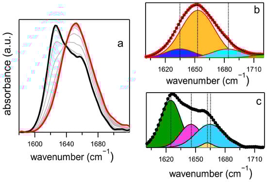 (a) Time evolution of the amide I band of human insulin. The absorption spectrum at t = 0 is reported in red, that acquired after 4 h in black. Gray curves represent absorption spectra at intermediate times. (b) Gaussian deconvolution of the t = 0 spectrum. The orange-filled curve represents the α-helix contribution, the cyan one the loops and turns secondary structures and the blue curve the β-sheet contribution. (c) Spectral deconvolution at the final stage of incubation. Green and purple filled curves represent the fibril β-parallel and the random coil secondary structures, respectively. Vertical dashed lines in panels (b,c) indicate the central frequencies of the Gaussian contributions.