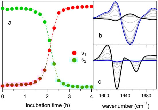 PCA analysis of the FTIR spectra. (a) Scores s1 (red) and s2 (green) reported vs. time. Fit to data are performed according to Equation (3). (b,c) Time evolution of the quantities (b) and (c), respectively. The blue spectrum corresponds to the initial state, the black one to the final. Gray spectra refer to intermediate incubation times.