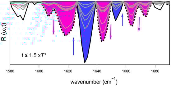 A Bruker IFS66VS Michelson interferometer (Bruker, Billerica, MA, USA) was used for the FTIR analysis. The instrument was equipped with a KBr beamsplitter and a DTGS detector, with the spectral resolution set at 4 cm−1. A custom-built spectroscopic cell (sealed with CaF2 windows and featuring a 25 μm optical path) was housed in the interferometer and filled with a 20 μL drop of the solution. The cell temperature could be varied via external liquid circulation. The entire setup was thermalized at 65 °C in less than 5 min. Infrared spectra were acquired overnight at fixed time intervals of 10 and 4 min, while keeping the entire setup under vacuum. Infrared absorption spectra were pre-processed using the Opus software v6.0 for baseline subtraction and normalization []. Second-derivative PCA analysis was performed using the NIPALS algorithm from the Parvus package version 0.5.8 []. Final data analysis was conducted using Igor Pro v9 software [].