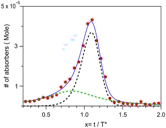 In Equation (4), the constant represents the ratio between the rate of nuclei formation and their dissociation. Notably, the order n in Equation (4) does not necessarily correspond to the number of monomers forming nuclei; rather, it can be determined from macroscopic observations, such as T* and concentration []. However, the value n = 2 has been considered the most relevant order for promoting nucleation in the case of Aβ42 [], as it accurately reproduces experimental data and provides reliable rate values. Following this approach, we used Boltzmann curves for [M(t)] and [m(t)] to fit the experimental data in Figure 7d (Supplementary Materials, S4) while setting n = 2. In Figure 8, an example of the best fit to the data is shown. The asymmetry of the experimental curve is likely due to absorption processes unrelated to surface-promoted effects, such as contributions from oligomers at t < T* and accounted in the fit with a Lorentzian contribution. The fitting procedure yields an average value of T*/T0 = 11, which is in good agreement with the phenomenological value obtained from Figure 5 and aligns with data from the literature []. Additionally, the rate constant for secondary nuclei formation is obtained, K2 = 7.3 × 104 M−2 sec−1. The uncertainty in this value is about 30%, mainly arising from the estimation of the final fibril concentration based on SEM analysis. Despite this uncertainty, the determined rate constant is consistent with that reported for the Aβ42 peptide, indicating that the aggregation mechanisms are likely similar in both systems.