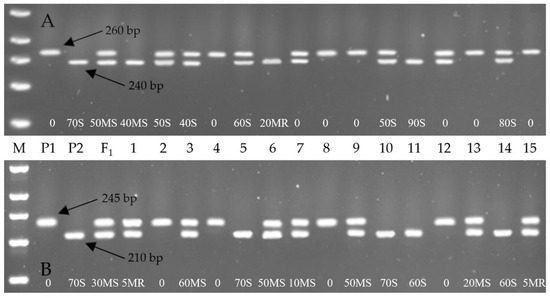 In the present study, the Barc008 amplified distinct alleles: 245 bp in the resistant parent (Yr15/6*Avocet S) and 210 bp in the susceptible parent (Grom), which aligns with the findings reported by Padhy et al. [32]. The literature reveals considerable variation in the allele sizes for Barc008 in different resistance/susceptible genotypes across different genotypes: 250/280 bp [33], 260/280 bp [27], 185/230 bp [21], 221/257 bp [34], 221/- bp [35], 245/210 bp [32], and 190/230 bp [36]. These differences highlight the genetic diversity and potential environmental or epistatic effects of that marker’s expression. Such variation, while presenting challenges in standardization, also represents an opportunity for plant breeders and geneticists. On one hand, it requires careful consideration; on the other hand, it also expands opportunities for fine-mapping resistance loci and enhancing the precision of molecular breeding.