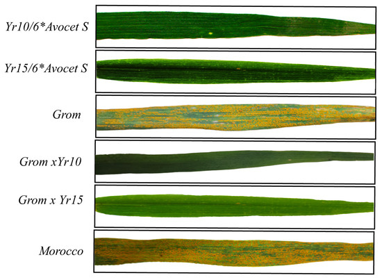 Phenotypical evaluation of yellow rust resistance in wheat leaves under artificial infection conditions. Image displays representative leaves of parental donor lines Yr10/6*Avocet S (harboring the Yr10 gene) and Yr15/6*Avocet S (harboring the Yr15 gene); the susceptible high-yielding recurrent parent Grom; newly developed ABLs, Grom × Yr10 and Grom × Yr15; and the susceptible check cultivar Morocco. Clear differences in disease severity are observed, with ABLs showing resistance comparable to the donor lines, while Grom and Morocco exhibit extensive stripe rust symptoms.