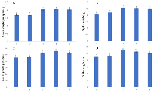 Statistical assessment of yield trait variability among samples using ANOVA and post-hoc analysis. (A) Grain weight per spike (g); (B) Spike weight (g); (C) Number of grains per spike; (D) Spike length (cm). 1: Yr10/6*Avocet S; 2: Yr15/6*Avocet S; 3: Grom; 4: Grom-Yr10; 5: Grom-Yr15. Different lowercase letters above the bars indicate significant differences between genotypes at p < 0.05 according to Tukey’s HSD test. Error bars represent standard errors of the means.