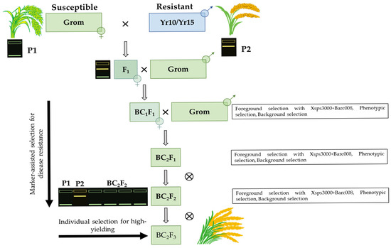 Schematic representation of marker-assisted backcrossing for introgression of yellow rust resistance genes into Grom cultivar.