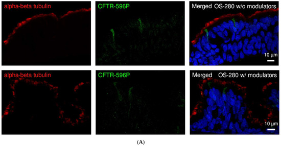 (A) CFTR antibody staining on cryosections of air–liquid interface cultured cells (ALI). Respiratory epithelial cells, cultured at air–liquid interface were stained to visualize CFTR (cystic fibrosis transmembrane regulator) expression with anti-CFTR 596P antibody (green, 1:250) and the cilia using antibodies for ciliary marker against the alpha-beta tubulin (red, 1:1000) for both healthy control (HC) and cystic fibrosis (CF) (OS-344 (c.1521_1523delCTT/p.Ile336Lys) and OS-495 (F508del (c.1521_1523delCTT het)). Apparent overlap of CFTR and cilia signals may result from closely adjacent cells in the pseudostratified epithelium and does not necessarily indicate CFTR expression within ciliated cells. Nuclear staining (blue) was performed using Hoechst33342. Scale bars are 10 µm, respectively. (B) Enlarged vision of CFTR immunostaining in HC at 63X magnification.