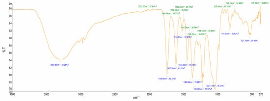 FTIR spectrum of aqueous extract from A. quanzensis bark; %T: Transmittance (%); cm−1: Wavenumber (cm−1).