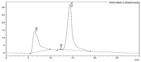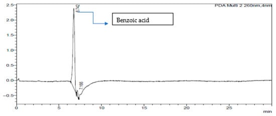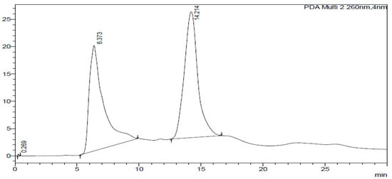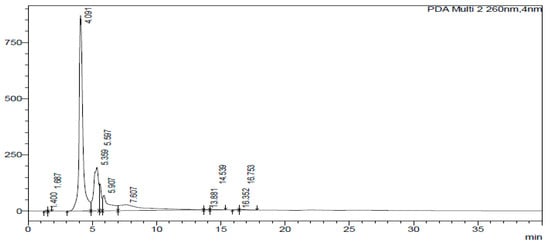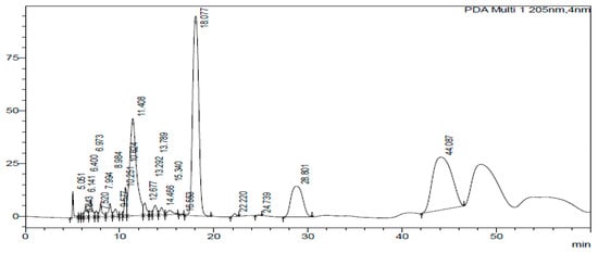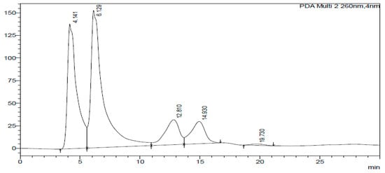 A stock solution of water, ethanol, methanol, hexane, and ethyl acetate extracts was prepared. High-performance liquid chromatography–diode array detection (HPLC-DAD) analysis was carried out using an Agilent HPLC 1200 infinity series system, equipped with a photodiode array detector (Agilent Technologies, Waldbronn Germany). The chromatograms were recorded at 205 and 260 nm. An Agilent Zorbax Eclipse Plus C18 column (3.5 µm × 150 mm × 4.6 nm) (Agilent, Newport, CA, USA) was operated at an oven temperature of 25 °C. The mobile phase was a mixture of 30% water (mobile phase A) and 70% methanol (mobile phase C). A flow rate of 1 mL/min was used throughout the analysis. The eluate was injected into HPLC-DAD system for quantitative and qualitative analysis []. An OHAUS starter 2100 pH meter (Pine Brook, NJ, USA) was used for pH adjustments of the reagents and to measure the pH of the samples. The results were obtained in chromatograms showing the peaks of identified compounds. The analysis was performed in triplicate.