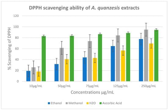 The antioxidant activity of the medicinal plant was studied by monitoring the ability of the plant extracts to scavenge free radicals generated in vitro. The aqueous, ethanol, and methanol extracts of A. quanzensis bark were examined for their ability to scavenge DPPH radical. All the extracts demonstrated dose-dependent DPPH scavenging activities. Methanol extract exhibited the highest antioxidant properties when compared to ascorbic acid, a standard antioxidant. According to Kandawa-Schulz et al. [], methanol extracts tend to show higher antioxidant activity compared to other extracts. There are studies which have described the antifungal activity [], antibacterial and antioxidant activity of A. quanzensis [].