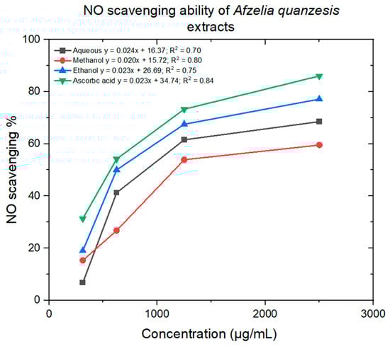 NO scavenging activity of ethanol, methanol, and aqueous extracts.