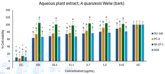 Antiproliferative effects of A. quanzensis bark aqueous extract against selected cancer cell lines (UC and DC mean untreated control and drug control, respectively) as determined by the MTT assay. Means are an average of six concentrations for each extract ± SD. Error bars with different letters are significantly different (p < 0.05). Asterisk represents a significant difference from the untreated control.