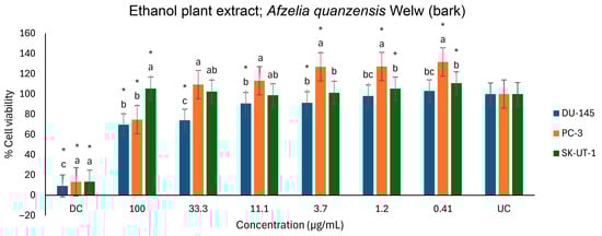 Antiproliferative effects of A. quanzensis bark ethanol extract against selected cancer cell lines (UC and DC mean untreated control and drug control, respectively) as determined by the MTT assay. Means are an average of six concentrations for each extract ± SD. Error bars with different letters are significantly different (p < 0.05). Asterisk represents a significant difference from the untreated control.