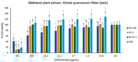 Antiproliferative effects of A. quanzensis bark methanol extract against selected cancer cell lines (UC and DC mean untreated control and drug control, respectively) as determined by the MTT assay. Means are an average of six concentrations for each extract ± SD. Error bars with different letters are significantly different (p < 0.05). Asterisk represents a significant difference from the untreated control.