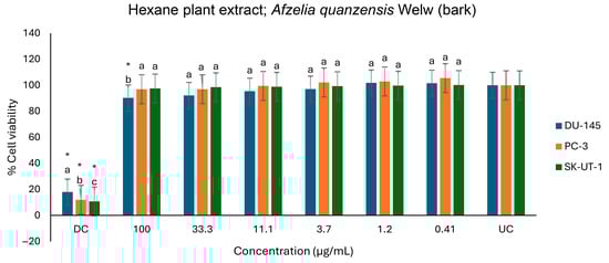 Antiproliferative effects of A. quanzensis bark hexane extract against selected cancer cell lines (UC and DC mean untreated control and drug control, respectively) as determined by the MTT assay. Means are an average of six concentrations for each extract ± SD. Error bars with different letters are significantly different (p < 0.05). Asterisk represents a significant difference from the untreated control.